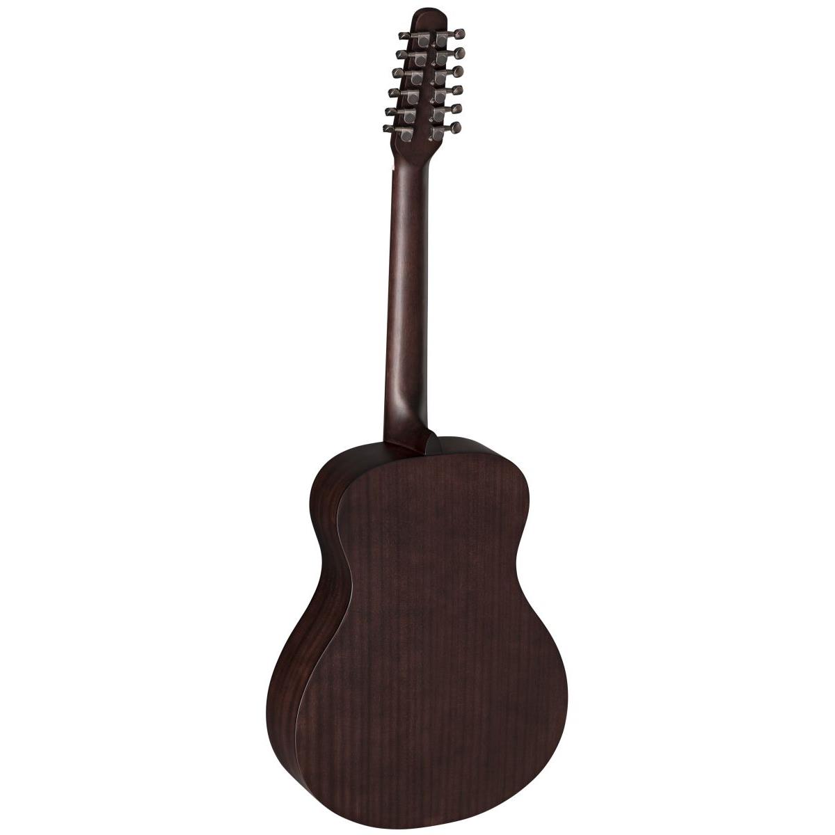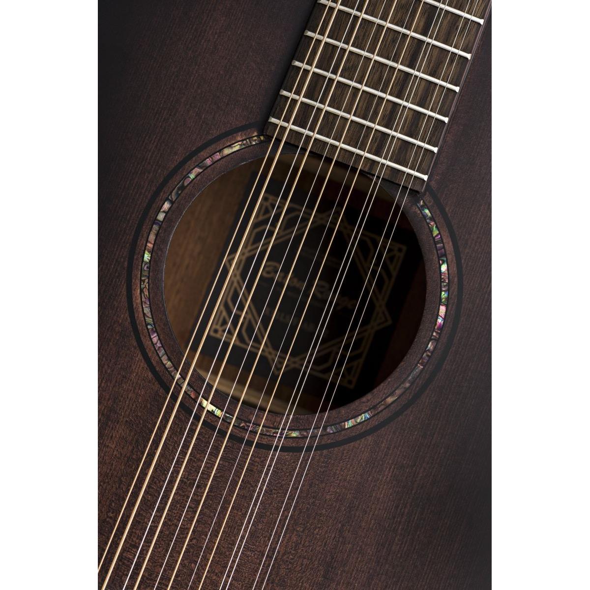 12-strunowa konstrukcja oferuje szersze spektrum harmoniczne, bogatsze brzmienie i wyjątkowy rezonans – idealny do akompaniamentu, grania arpeggio i stylu folkowego. Gitara posiada także krótszą skalę 630 mm, co zwiększa komfort gry mimo dodatkowego naciągu strun.