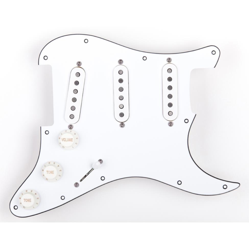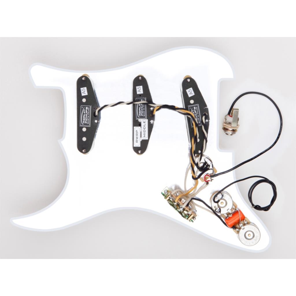 Kompletna płytka do gitary typu Stratocaster. Na pokładzie trzy single Classic Strat Single Coil (Merlin2 Pickups), trzy potencjometry 250kA CTS (USA), kondensator barwy Orange Drop (USA), pięciopozycyjny przełącznik Oak Grigsby (USA), oraz gniazdo jack Switchcraft (USA). Środkowy singiel odwrotnie nawinięty i odwrotnie spolaryzowany, co zapewnia brak brumu w 2 i 4 pozycji przełącznika (single pracują wtedy parami). Płytka jest trójwarstwowa, ekranowana folią aluminiową. Cały układ jest profesjonalnie zmontowany, uruchomiony i sprawdzony. Wszystkie elementy są nowe. W zestawie jest również komplet wkrętów do montażu płytki w gitarze. Tylko zamontować i grać. Brzmienie - klasyczny Strat. Jest to zestaw przeznaczony dla gitarzystów, którzy chcą mieć w swoim instrumencie profesjonalną elektronikę na światowym poziomie.