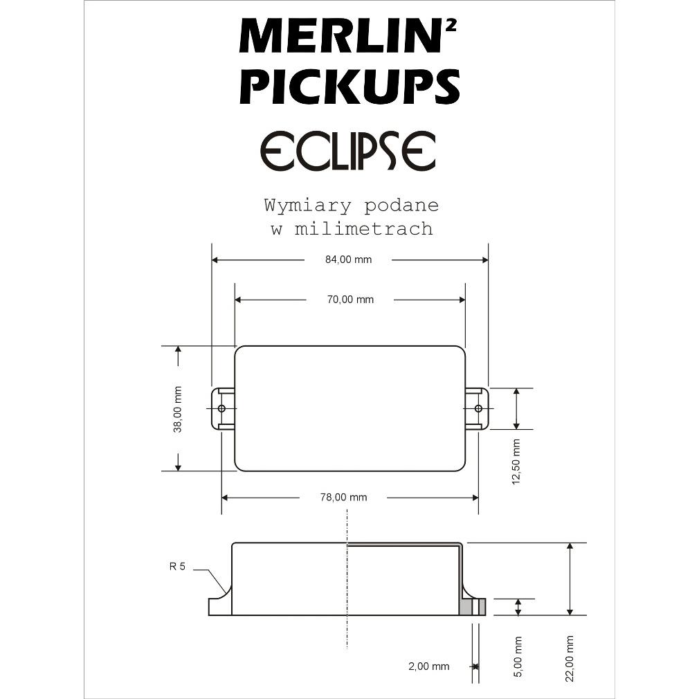 Eclipse Active to nowoczesny, bardzo uniwersalny, aktywny humbucker gitarowy. Przy jego budowie zastosowano wszystkie nowoczesne technologie, opracowane przez lata w firmie Merlin2 Pickups. Uzwojenia przetwornika są utwardzane woskiem metodą próżniową, co gwarantuje najwyższą odporność przetwornika na sprzężenia mikrofonowe. Zarówno kształt, jak i materiał, z jakiego wykonano rdzenie sztabkowe Eclipse Active zapewniają doskonałe ukształtowanie pola magnetycznego. Siła pola magnetycznego i kształt zostały tak dobrane, aby nie wpływały negatywnie na naturalny sustain i intonację instrumentu. Eclipse Active obejmuje wszystkie rozstawy strun stosowane w gitarach sześciostrunowych. Układ elektroniczny (przedwzmacniacz), który stanowi integralną część humbuckera Eclipse Active, został bardzo starannie zaprojektowany i ręcznie wykonany w technologii SMD przy użyciu najwyższej klasy elementów elektronicznych. Przedwzmacniacz ma ultraliniową charakterystykę pasmową, co zapewnia perfekcyjne przekazywanie naturalnego brzmienia samego przetwornika oraz instrumentu. Przedwzmacniacz jest standardowo zasilany napięciem 9VDC, ale może być bezpiecznie zasilany napięciem aż do 36VDC. Impedancja wyjściowa wynosi 10kOhm. Symetryczne połączenie przetwornika z przedwzmacniaczem oraz fakt, że przetwornik wraz z układem elektronicznym są całkowicie zaekranowane sprawiają, że Eclipse Active jest bardzo odporny na zewnętrzne zakłócenia i ma rewelacyjny stosunek sygnału użytecznego do szumów. Dzięki temu montując ten przetwornik w gitarze nie ma potrzeby wykonywania połączenia masy układu gitary z mostkiem (strunami). Brak tego połączenia zabezpiecza gitarzystę w niektórych sytuacjach przed porażeniem prądem. Aktywny humbucker Eclipse Active dostarcza silnego, a jednocześnie pozbawionego zakłóceń sygnału, który doskonale nadaje się do dalszej obróbki przy pomocy efektów, preampów, multiefektów i innych urządzeń. Niska impedancja przetwornika Eclipse Active umożliwia stosowanie długich kabli bez utraty pasma i dynamiki. Eclipse Active to bardzo dynamiczny i selektywny przetwornik. Bardzo dobrze sprawdza się zarówno w lekkich rockowych klimatach, jak i w najcięższych odmianach metalu granych na ekstremalnych gainach i w obniżonych strojach. Wraz z przetwornikiem dostarczane są wstępnie połączone potencjometry volume i tone, gniazdo jack stereo, klips do baterii 9VDC, przewód łączący przetwornik z układem gitary, sprężynki montażowe i wkręty oraz instrukcja. Aktywny przetwornik Eclipse Active jest dostępny w wersji bridge i neck (wyłącznie w czarnych zamkniętych plastikowych obudowach). Humbucker Eclipse Active powinien być zasilany dobrej jakości alkaliczną baterią 9VDC (6LR61). Polecani producenci baterii to Duracell, Energizer, Varta, Panasonic. Należy pamiętać o wyjęciu wtyku jack z gniazda gitary po zakończonym graniu. Wyjęcie wtyku odłącza zasilanie od układu elektronicznego przetwornika a tym samym przedłuża żywotność baterii.