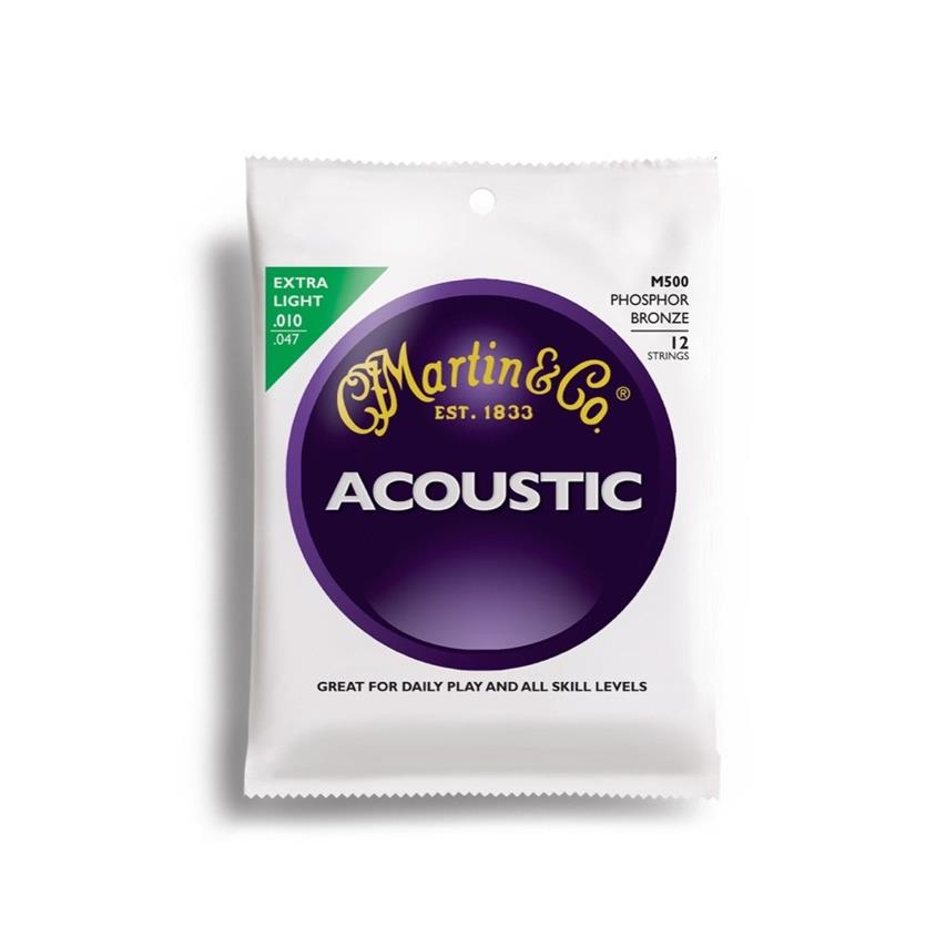 Martin M500 Light .010"-.047" Phosphore Bronze, to dobrej jakości struny do gitary akustycznej 12-strunowej. Nie są zbyt "jasne", oferują nam dużo "ciepłego" środkowego soundu i dobrą dynamikę. Struny M500 są rekomendowane do grania lżejszych odmian muzyki, gdzie akustyk ma za zadanie stworzyć nieprzytłaczające tło dla całego zespołu.