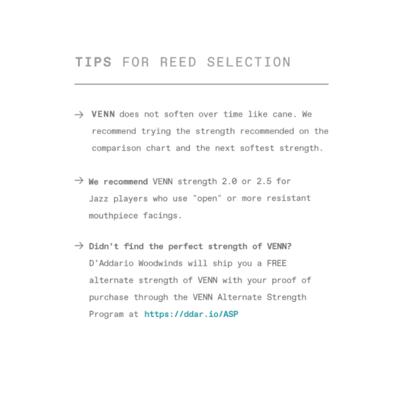 D'Addario VENN: zaawansowany syntetyczny stroik zbudowany z włókien polimerowych, żywicy i naturalnych elementów trzciny. Zaprojektowany, aby dać graczom korzyści płynące z syntetycznych stroików bez uszczerbku dla dźwięku i grywalności stroików trzcinowych.