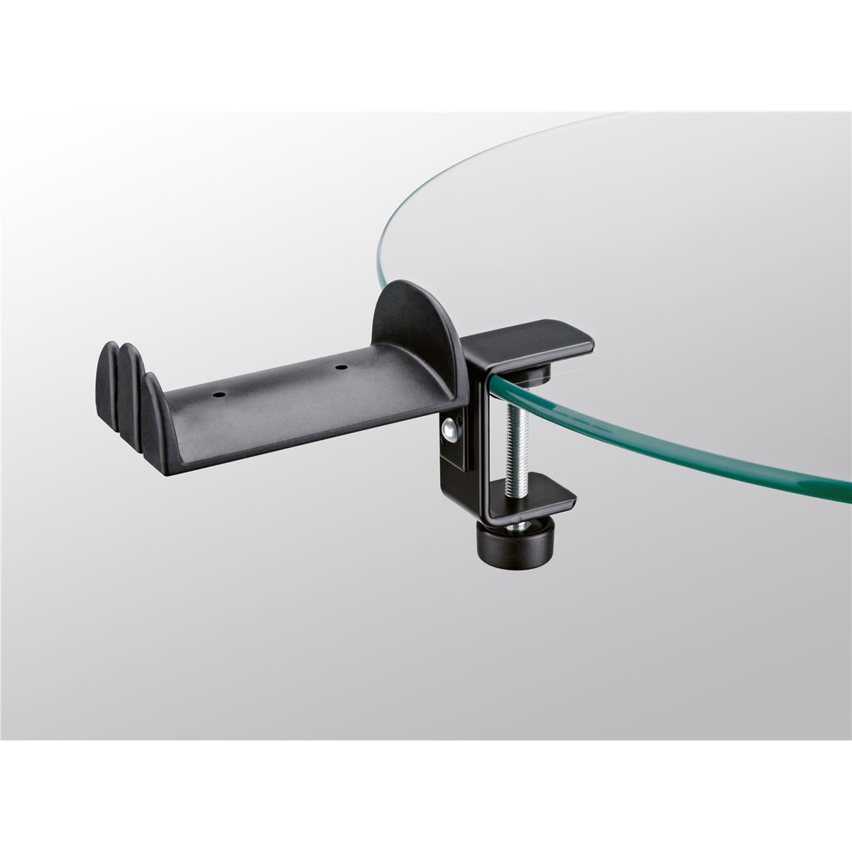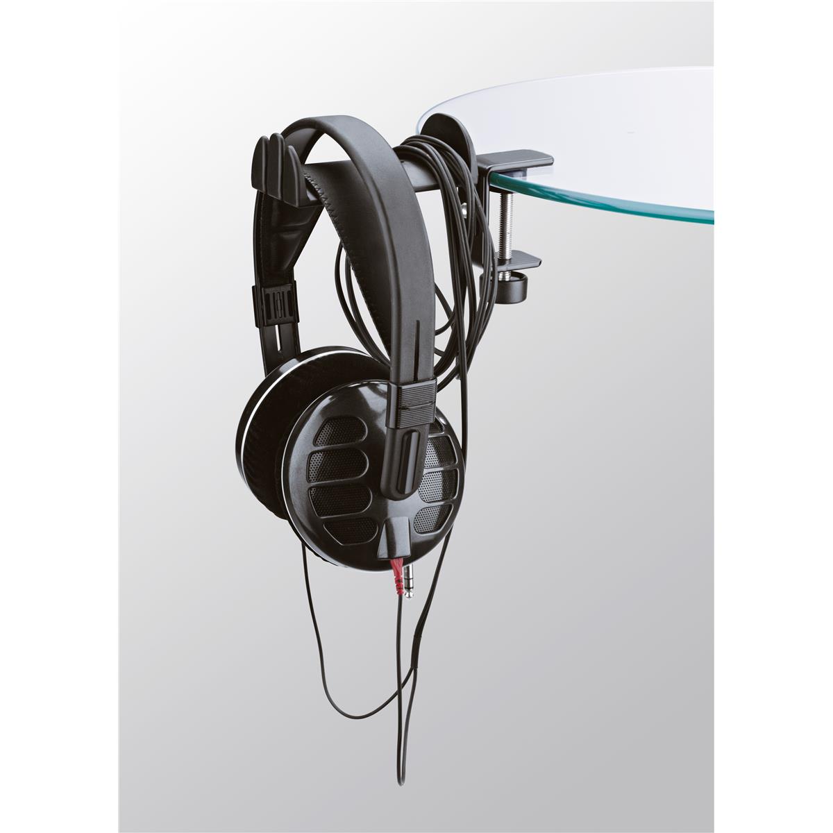 Ochronny i stabilny uchwyt pokryty miękką gumą na 2 standardowe słuchawki. Ponadto z przodu ramienia nośnego znajdują się rowki, w których można zawiesić dwie słuchawki douszne. Zacisk można wydłużyć od 0 do 45 mm, dzięki czemu można go zamontować na szerokiej gamie stołów, półek itp