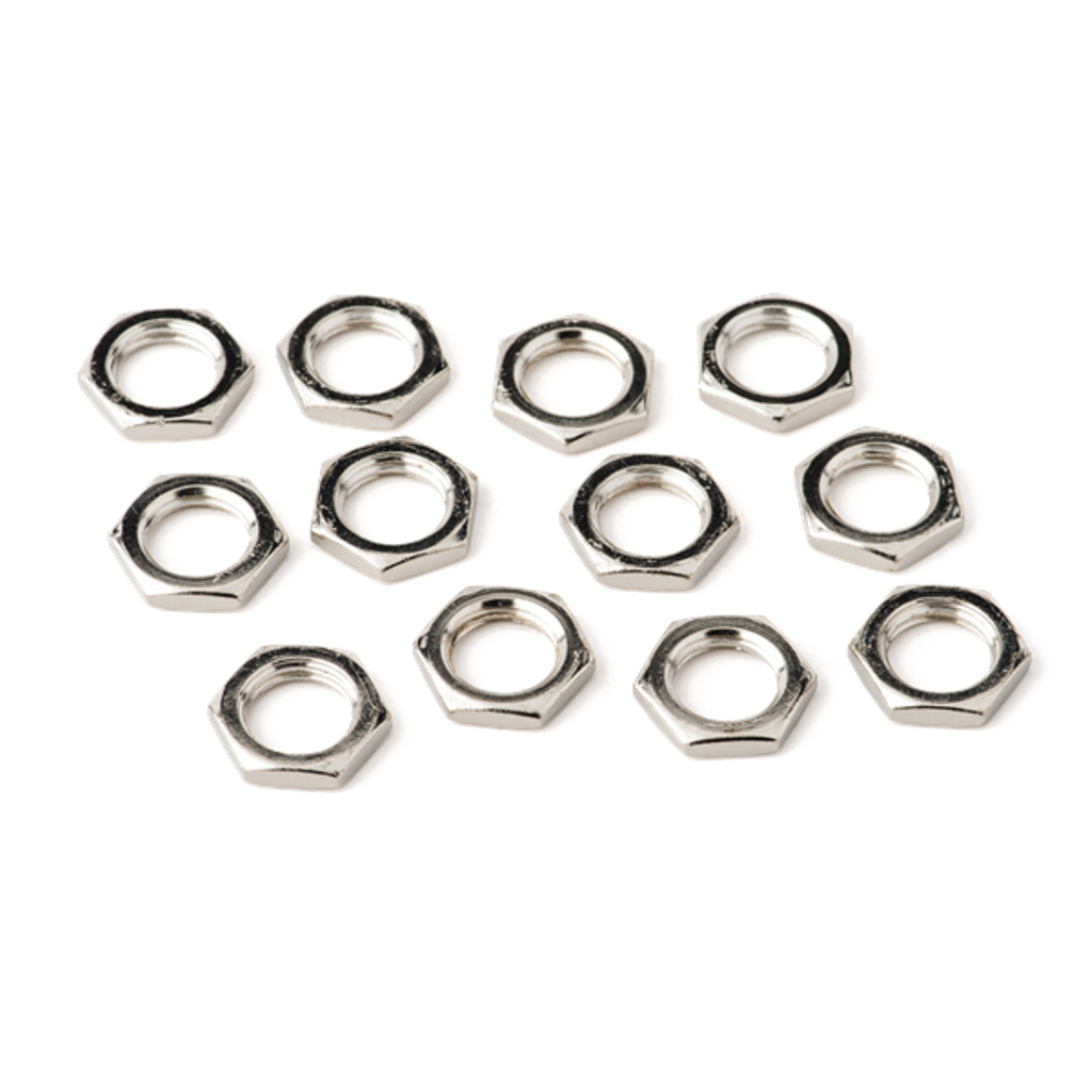 Opakowanie dwunastu niklowanych nakrętek jack 7/16 - 20 x 1/8 używanych z wieloma gniazdami wzmacniaczy Fender.